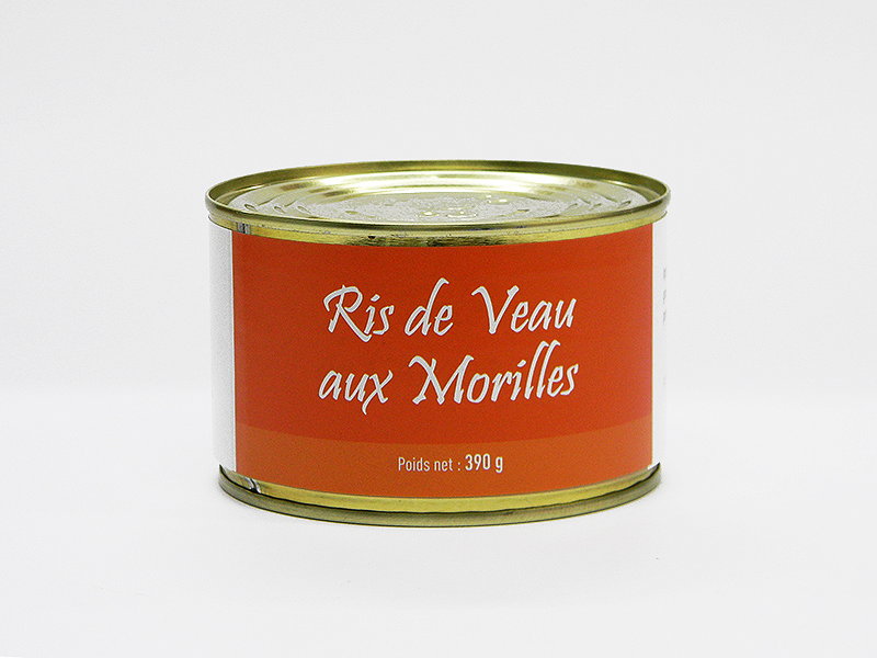 Ingrédients : Ris de veau 50%, roux (FARINE DE BLE et graisse de canard), bouillon de légumes maison (carotte, CELERI, poireau, oignon,échalotte, thym, persil, laurier, clou de girofle), morilles 4%.