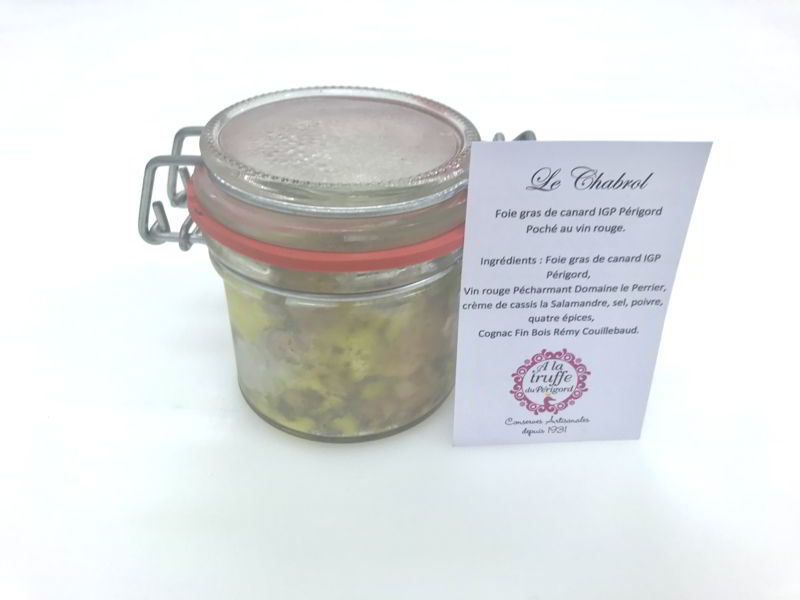 Produit ne Un foie gras de canard entier mi-cuit exceptionnel, poché dans un Pécharmant du Domaine Le Perrier avec un crème de cassis de la Distellerie la Salamandre. L'équilibre parfait, le Pécharmant n'étant pas utilisé pour masquer un goût mais pour apporter une rondeur et une longueur en bouche pour une dégustation unique.
