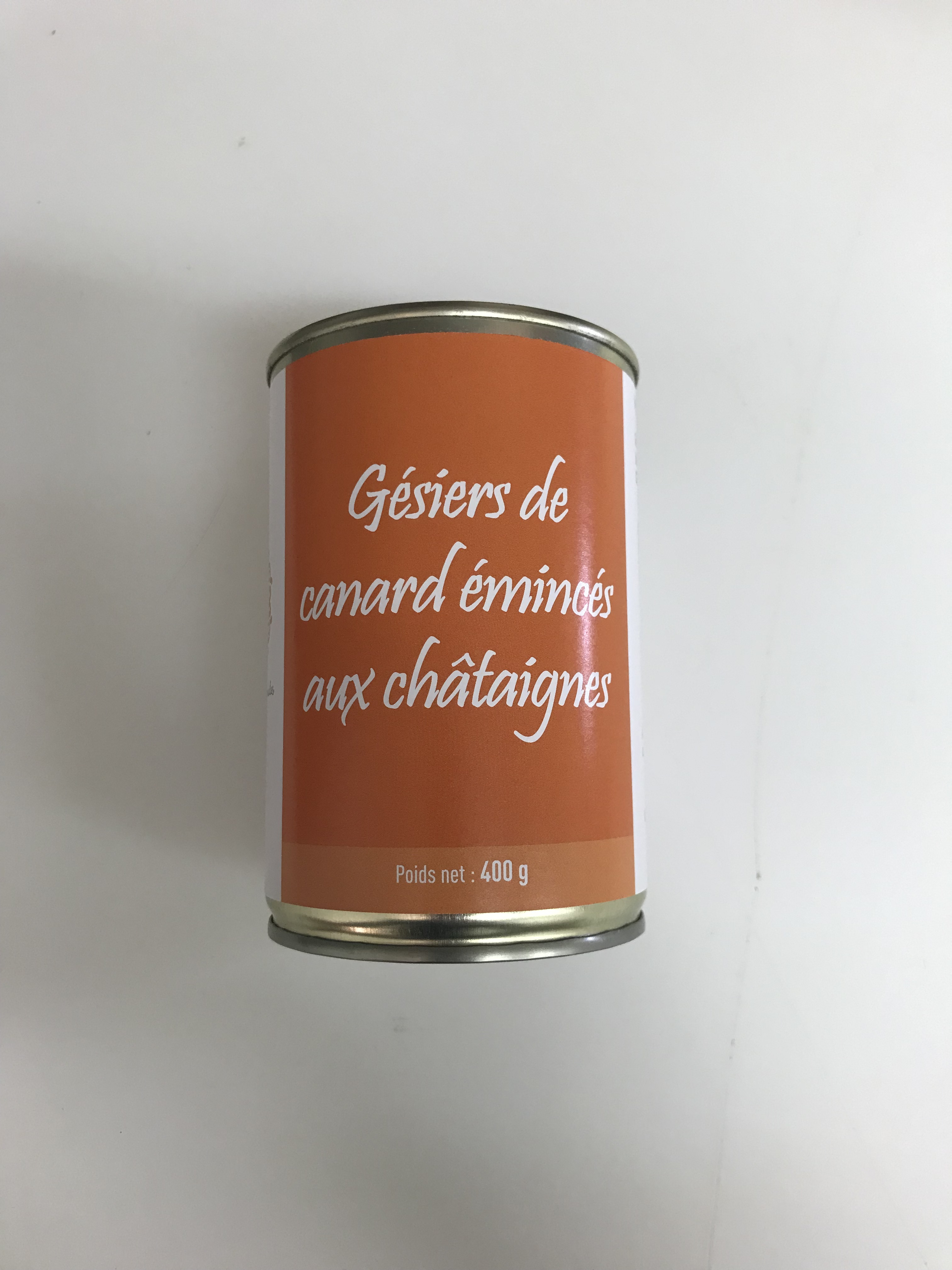 Ingrédients : Gésiers de canard du Périgord (70%) et châtaignes (30%) émincés.
